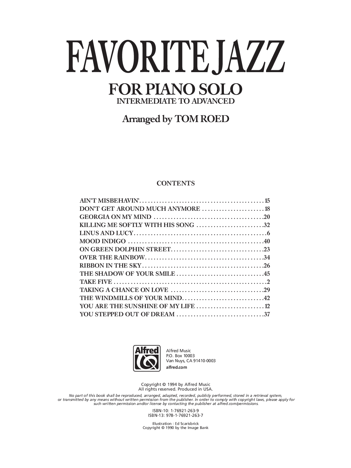 Fifteen favorite jazz tunes arranged for intermediate to advanced piano. Includes: Don't Get Around Much Anymore * Georgia on My Mind * Killing Me Softly with His Song * Mood Indigo * On Green Dolphin Street * The Shadow of Your Smile * Take Five and more.
