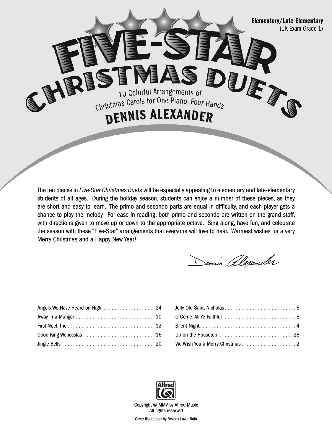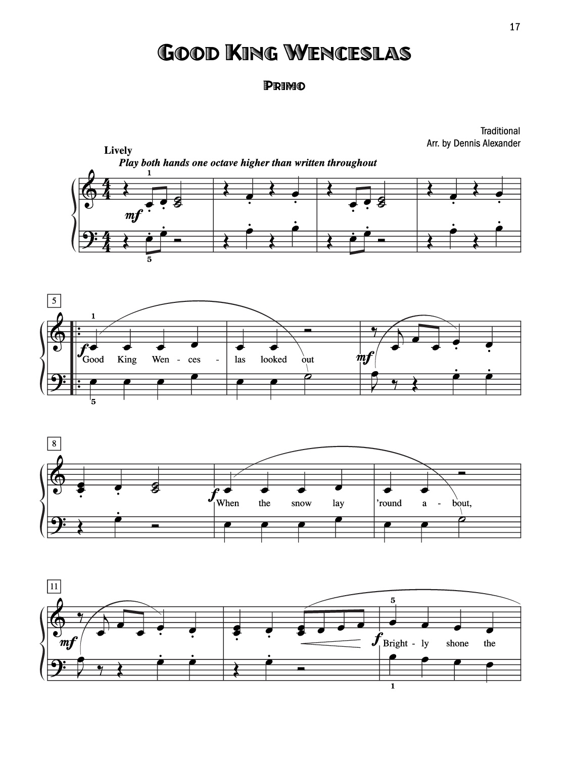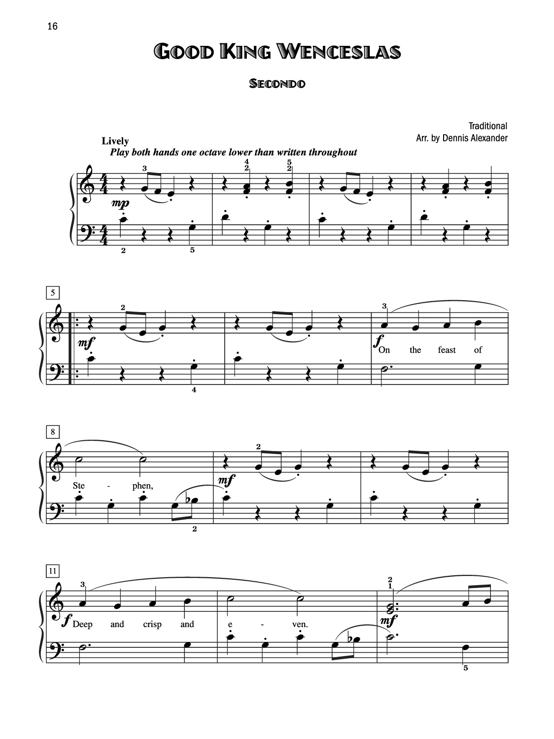 Sing along, have fun, and celebrate the season with these 10 arrangements that everyone will love to hear. The primo and secondo parts are equal in difficulty, and each player gets a chance to play the melody. For ease in reading, both primo and secondo are written on the grand staff, with directions given to move up or down to the appropriate octave.