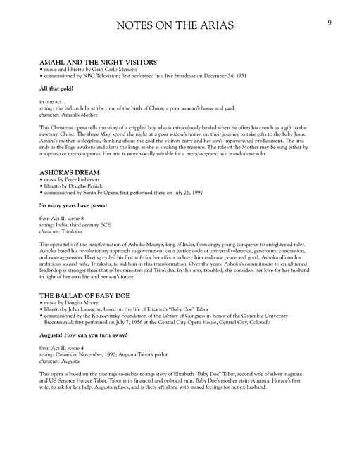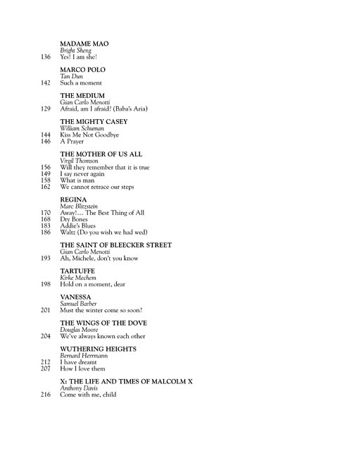 This landmark series, the first multi-volume aria anthology devoted entirely to the topic, collects compelling, useful, singer-friendly excerpts from the best of a distinctly American musical tradition. Plot notes and basic information about each opera are included. Opera composers such as Samuel Barber, William Bolcom, Douglas Moore, Virgil Thomson and Kurt Weill are represented. The operas of Gian Carlo Menotti are particularly present, with 26 arias from nine operas in the series.