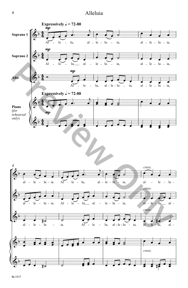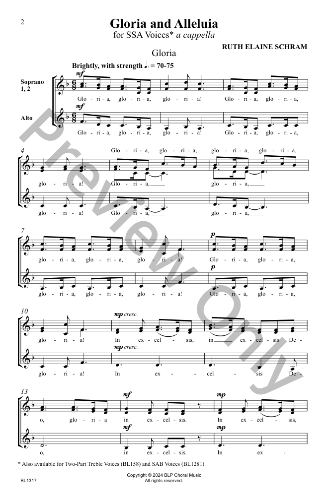 A wonderful a cappella piece! Gloria and Alleluia are two contrasting pieces that each offers their own unique sound. The Gloria is up tempo and rhythmic. The Alleluia is more legato. A cappella singing is definitely its own reward.