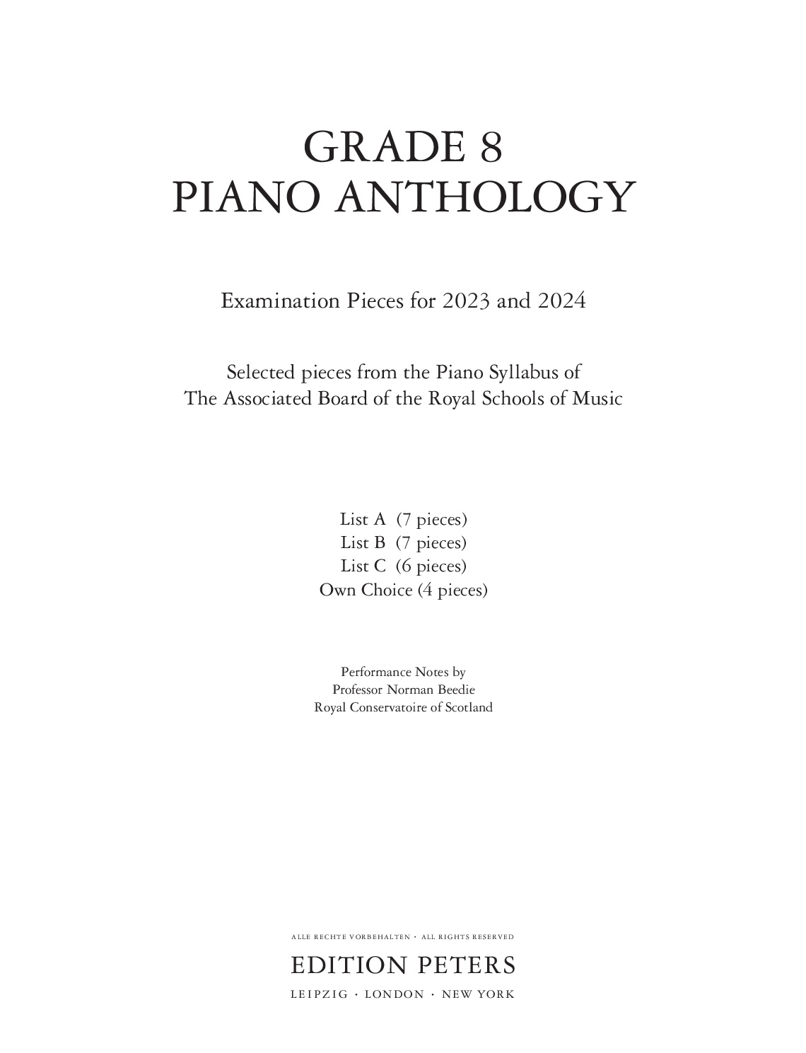 The Edition Peters Grade 8 Piano Anthology comprises 20 pieces from lists A, B and C of the Associated Board syllabus, together with 4 pieces suitable for the own-choice section of the Performance Exam. The anthology supports students preparing for either the Practical Exam or the Performance Exam. Those preparing for the Performance Exams are aided by Performance Notes by Norman Beedie (Lecturer in Classical Improvisation, Piano and Conducting at the Royal Conservatoire of Scotland), which give advice on technique and interpretation for each piece, and guidance on preparing an effective programme. The pieces in this volume are drawn from the extensive range of piano music in the Edition Peters catalogue — one of the widest available. The own-choice pieces provide a valuable selection of fascinating repertoire suitable for the Performance Exam.