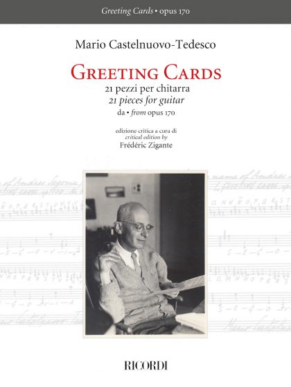 Mario Castelnuovo-Tedesco composed 52 Greeting Cards for various instruments between 1953 and 1967, collectively catalogued as opus 170, which he developed in a non-systematic manner up to the year before his death. These pieces were conceived as gifts for his interpreters and students, whom the author meant to gratify with these pleasant little vignettes. The 21 Greeting Cards for guitar, written from 1954 to 1967, are here collected for the first time.