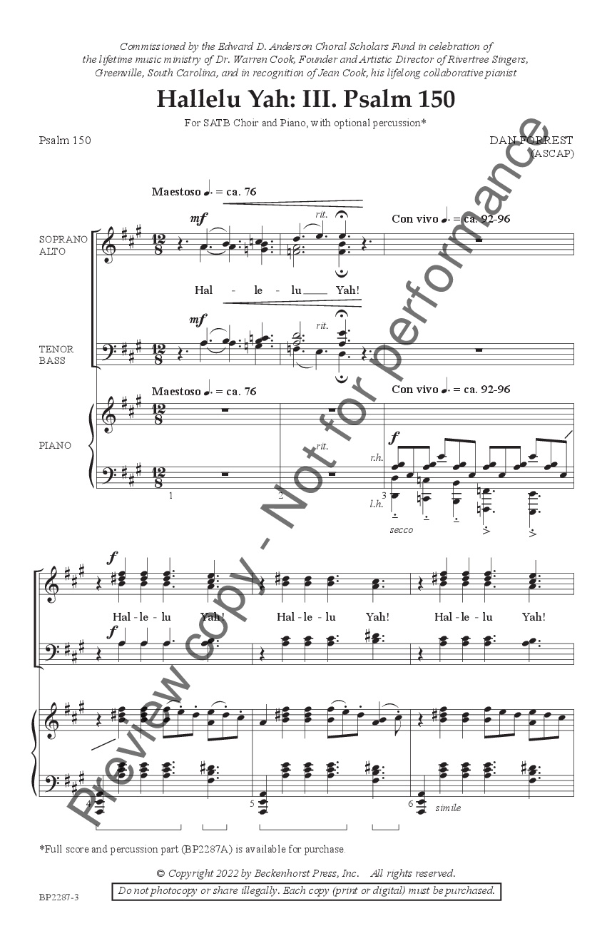 Dan Forrest's three settings of “Hallelujah Psalms” range from invigorating to deeply touching to dancing for joy! Each movement begins and ends with the statement “Hallelu Yah”, just as the three Psalms do. Optional percussion (inspired by the text of Psalm 150 and the scriptural account of the psalmist Asaph playing the cymbals; 1-2 players) adds an additional layer of sparkling energy. May be performed as a set or as individual movements, suitable for worship or concert settings.