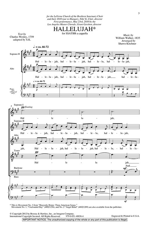 This amazing work, premiered by the Los Angeles Master Chorale, Grant Gershon, director, is a contrast of homophonic refrains against polyphonic verses. Beginning with the austere Sacred Harp tune “Heavenly Home,” California composer Kirchner sets “hallelujahs” leaping and plunging and circling through the choir to thrilling results.