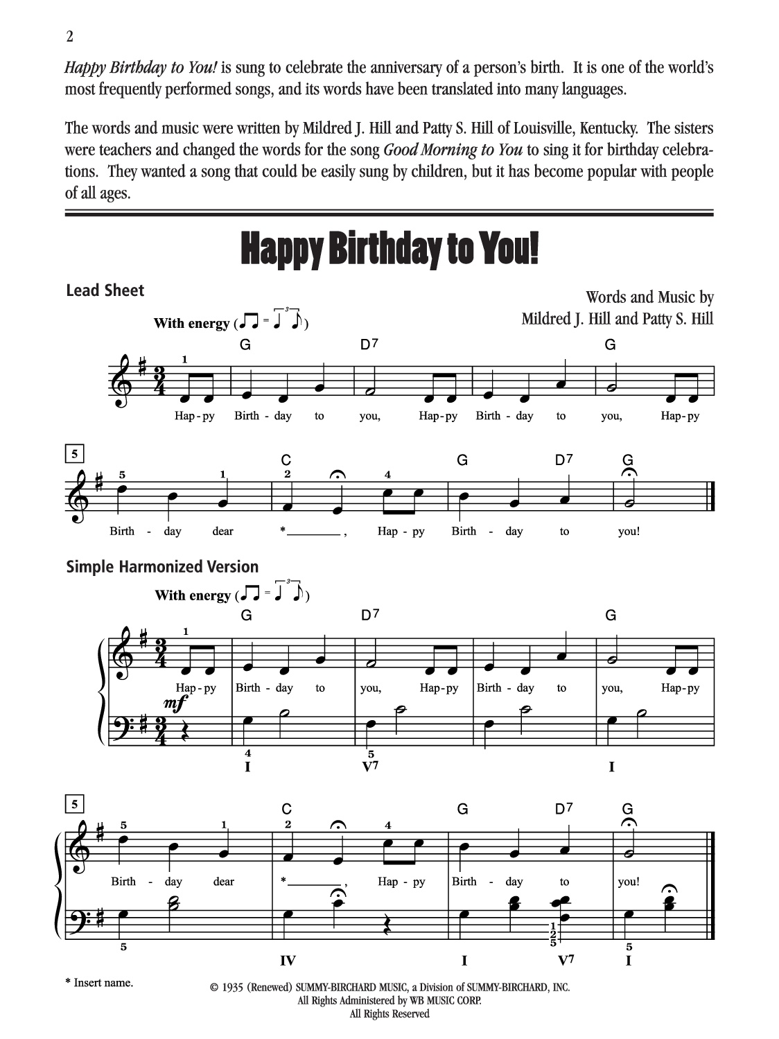 One of the world's most frequently performed melodies, Happy Birthday to You! is now arranged for Early Intermediate to Intermediate level pianists. This arrangement includes three versions: a lead sheet, a simple harmonized version, and a song version for birthday celebrations. Includes lyrics and chord symbols.