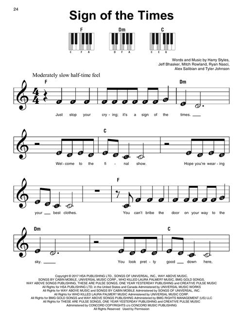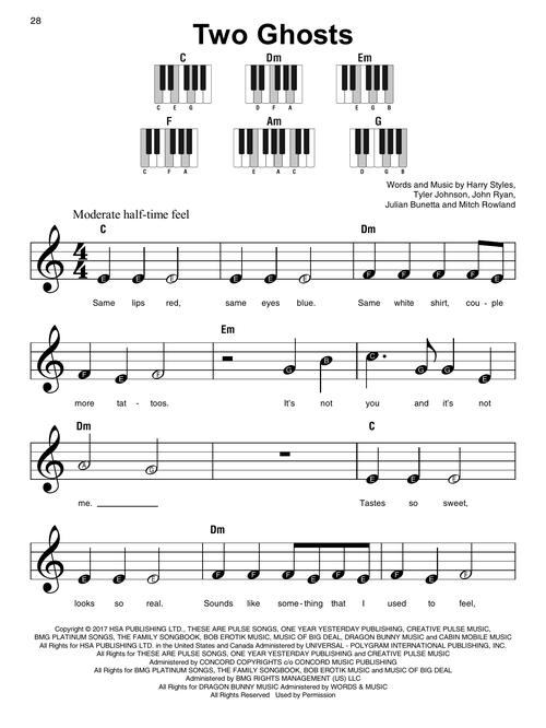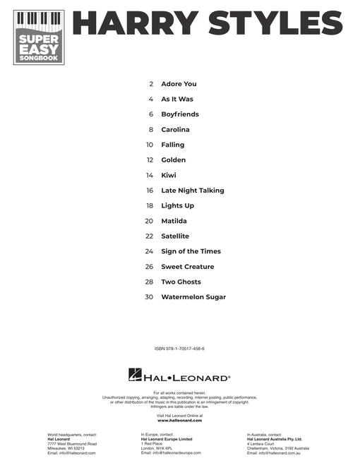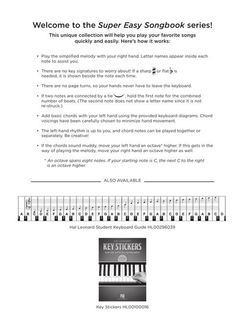 Our Super Easy Songbooks are designed for beginning keyboard players so they can enjoy playing the songs they love! The arrangements have no page turns, simple right-hand melody, letter names inside each note, and basic left-hand chord diagrams. Our Harry Styles collection features 15 favorites from his first three solo albums.