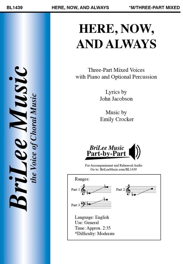 Here, Now, and Always by Emily Crocker and John Jacobson is an upbeat, light, and energetic piece for three-part mixed choir with optional percussion. Centered on saying goodbye while celebrating an enduring friendship, it looks ahead to a bright future and reminds singers that distance and time can’t diminish the bonds they share. Uplifting and spirited, it’s a wonderful choice for end-of-year performances or any moment that calls for joy and connection. Also available for Two-Part Treble Voices (BL1440)