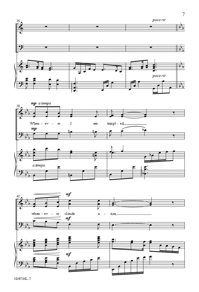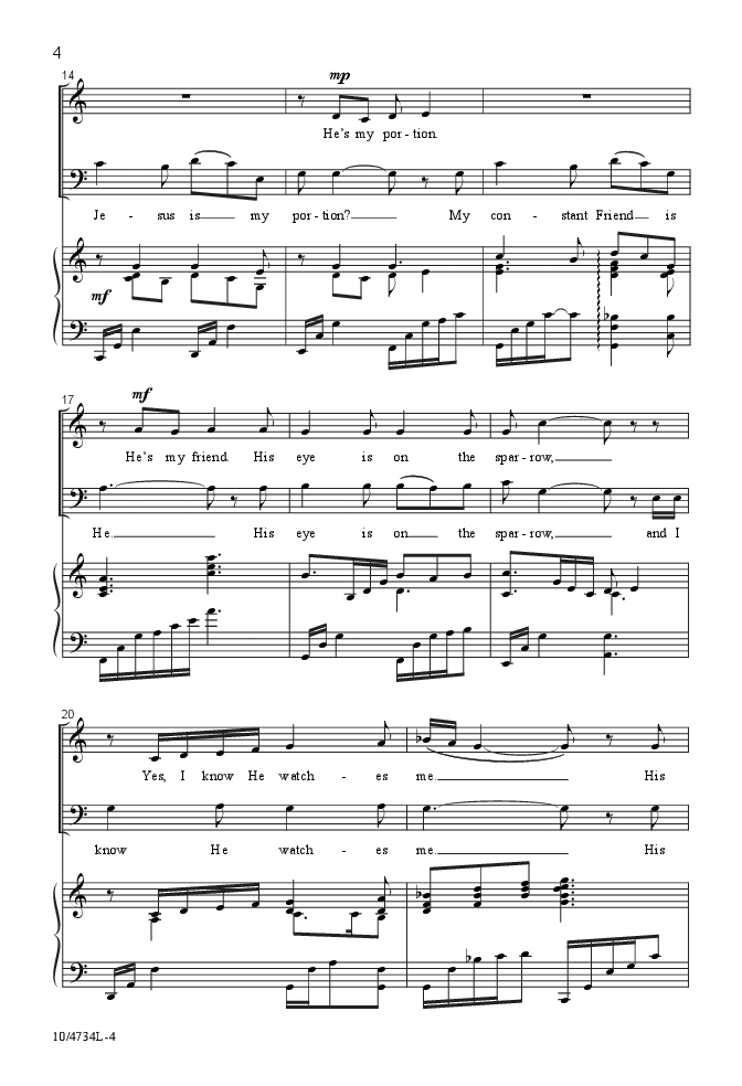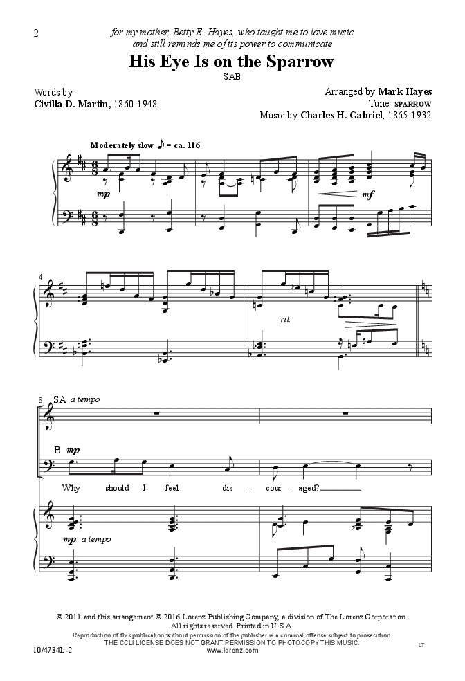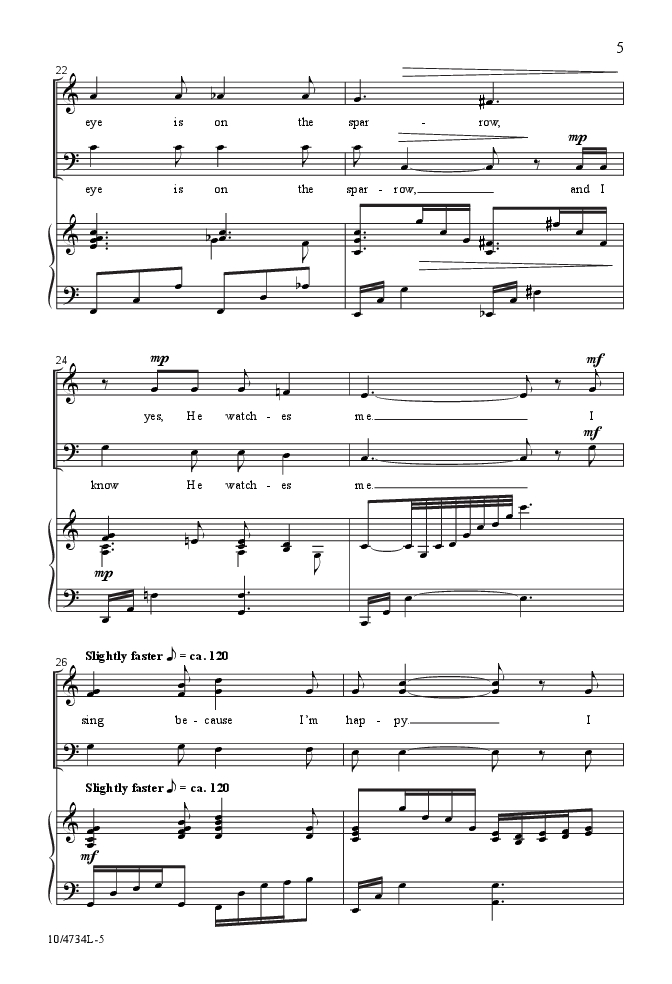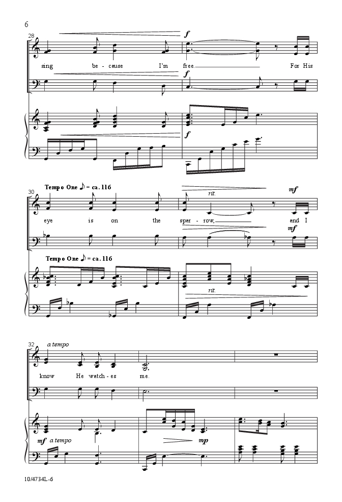 “…And I know He watches me.” Now available in an SAB voicing, Mark Hayes' elegantly styled arrangement is so tastefully done that a new generation of churchgoers will appreciate the simple, penetrating lyric in this gospel hymn. Accessible vocal lines and rich harmonies never compete with the song's character, but only enhance the message and encourage the assembled to “sing because I'm free.” Superb!