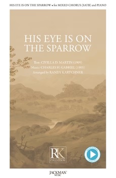 This inspired arrangement by Randy Kartchner is for SATB chorus and piano, and is filled with heart-warming emotion and colorful harmony. Loved for over a century, the Hymn “His Eye Is on the Sparrow” conveys the sweet security found in God's watchful care of all His creations, most especially His children. A Piano Accompaniment Part Download is available separately (piano only with lyric cues and chord symbols).