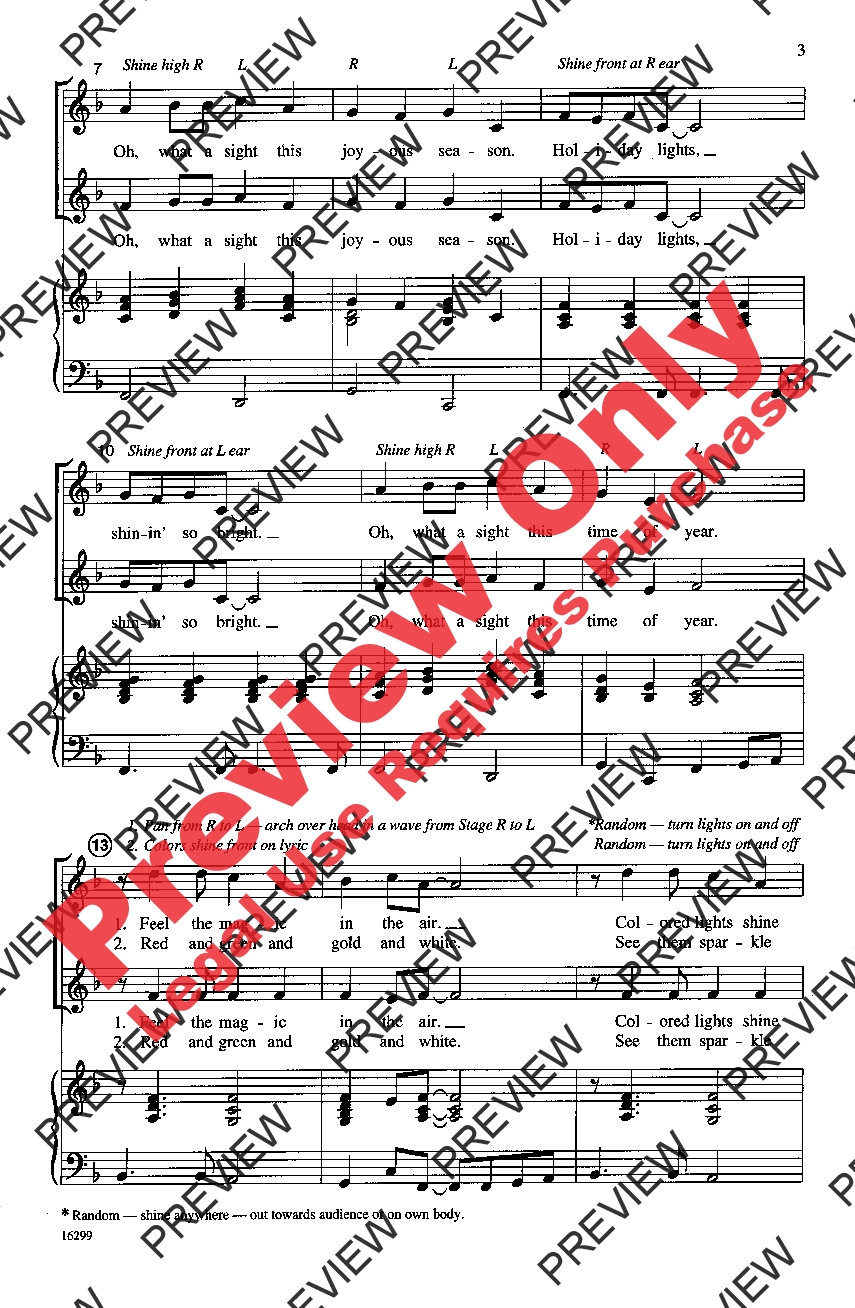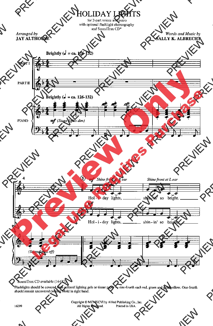 Flashlights covered with red, green, and gold tissue paper or cellophane make wonderful unexpected props for this multi-holiday choral feature. Use Sally's staging suggestions (included in the publication) or the upbeat SoundTrax CD, to set the mood for a very happy holiday. Staging is featured on “Follow Me to the Top!”