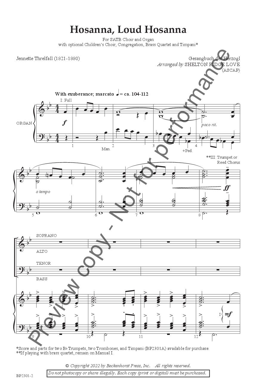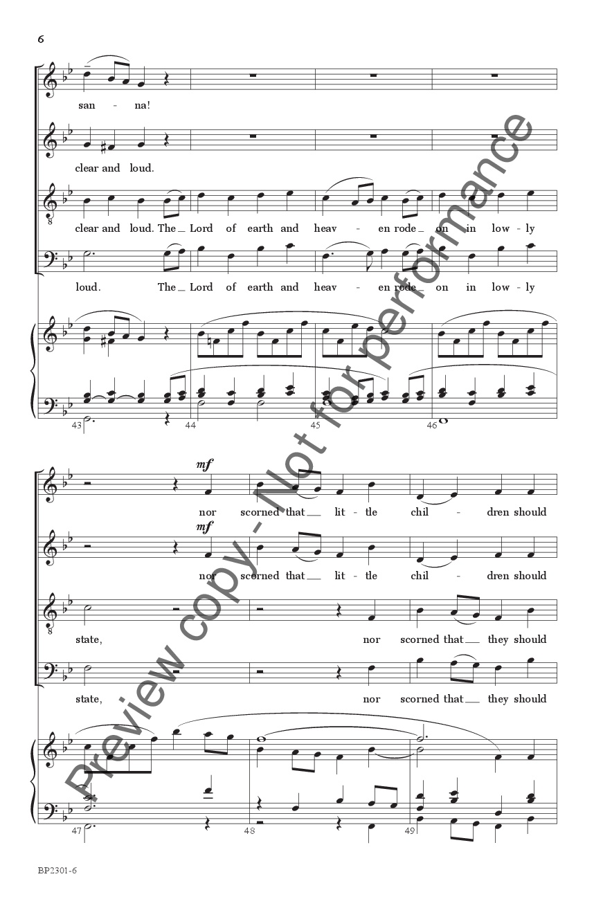 “As a church organist, I am constantly trying to produce creative introductions and hymn accompaniments that paint the lyrics and enhance congregational worship. One Sunday, I introduced the hymn “Hosanna, Loud Hosanna” by layering the opening motive, which gave the inspiration for many of the ideas in this arrangement. I imagined crowds of people singing in the streets as Jesus made his triumphal entry into Jerusalem. The arrangement incorporates children, some polyphonic moments, festive brass, and a descant to create that scene.”