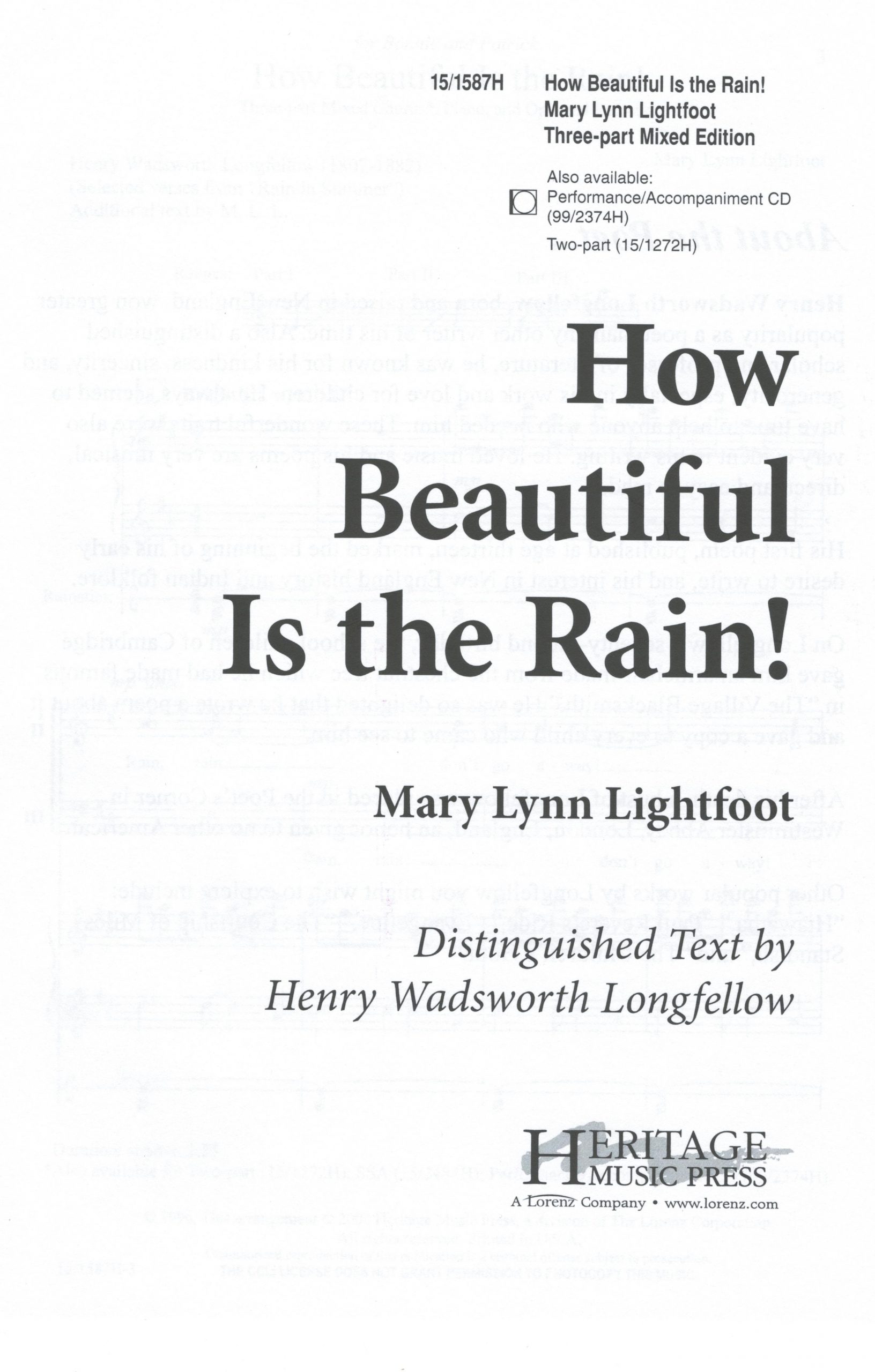 A best-seller in a new voicing, this bright, charming setting of selected verses from Henry Wadsworth Longfellow's poem “Rain In Summer” features strong, independent vocal lines and a dynamic accompaniment. The ample unison and echoed phrases are ideal tools for built-in success with developing choirs.
