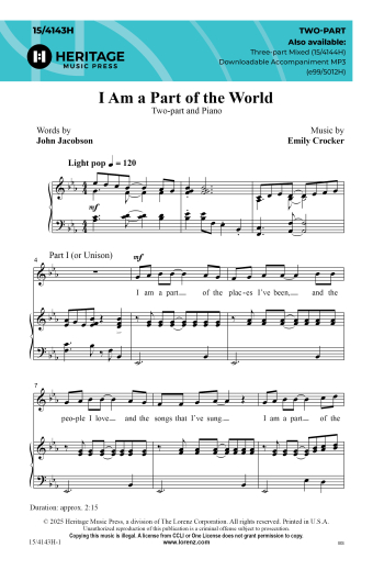 The iconic team of Emily Crocker and John Jacobson presents this vibrant song of unity for young choirs. The lyrics emphasize that we are shaped by the experiences we've had, the places we've been, and the people who surround us. With a light pop feel and catchy melody, this piece is perfect for choirs seeking an energetic, feel-good addition to their repertoire.