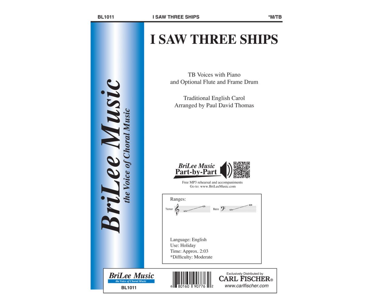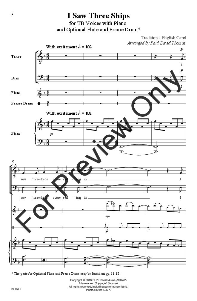Jolly and jaunty, rhythmic, and fun, Thomas' arrangement of “I Saw Three Ships” is highly energetic and sure to be a holiday favorite. Add the optional percussion and flute for an even more exciting performance for your tenor-bass ensemble.
