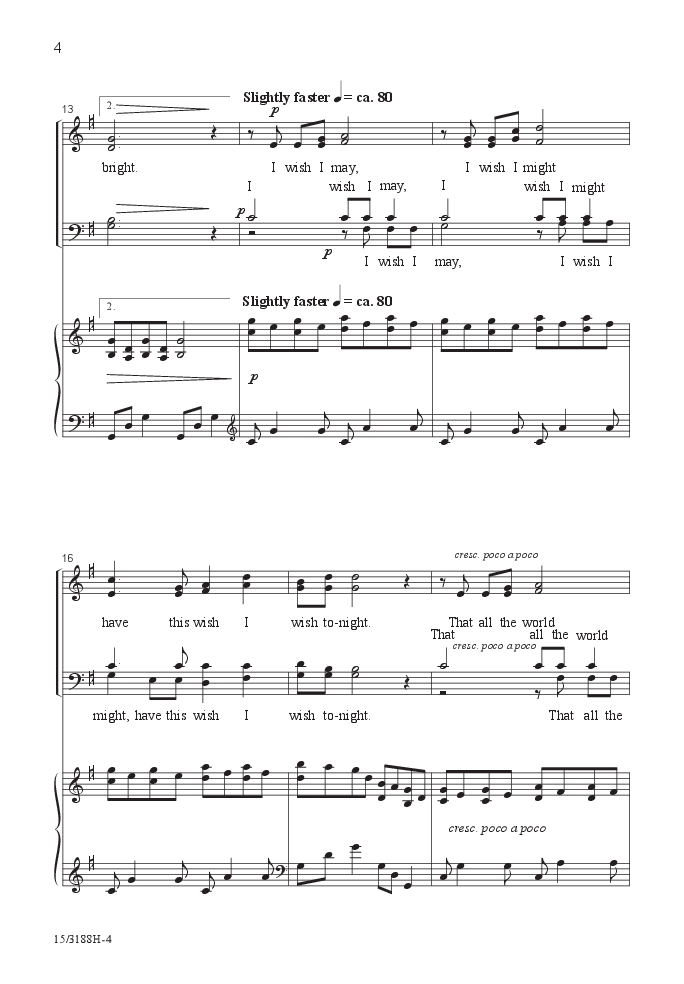 This touching piece for choirs of all ages offers a wish for the world to find the hope, peace, and love that it needs. With easily learned memorable melodies and a bridge featuring hints of “star light, star bright, first star I see tonight,” it is usable throughout the year as a song of peace and will make an especially effective addition to winter and holiday concerts.