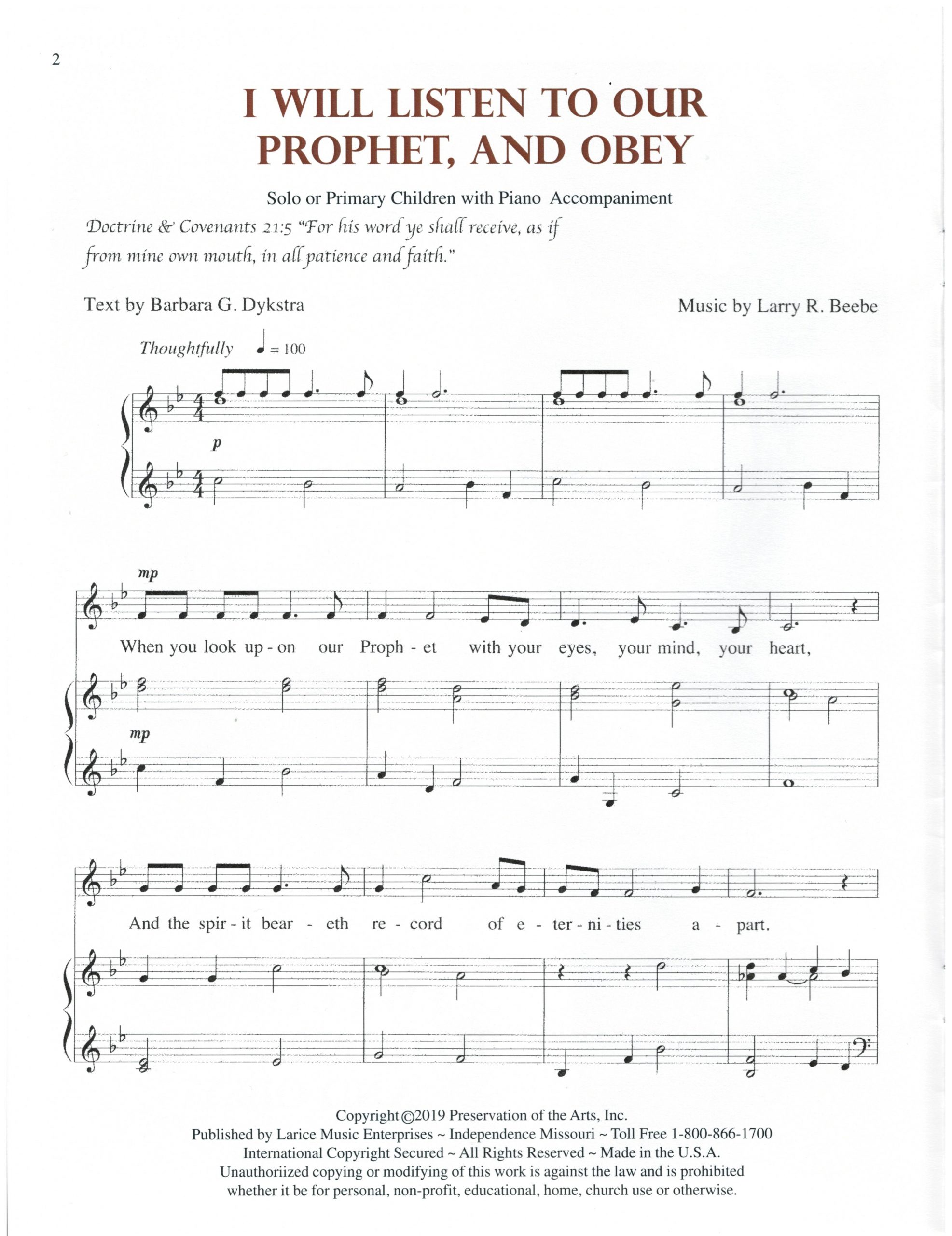 This is a timely message, and delightful song, with music by Larry R. Beebe and text by Barbara G. Dykstra. The message is timely with encouragement for our children and families to listen to our prophet and happily obey.