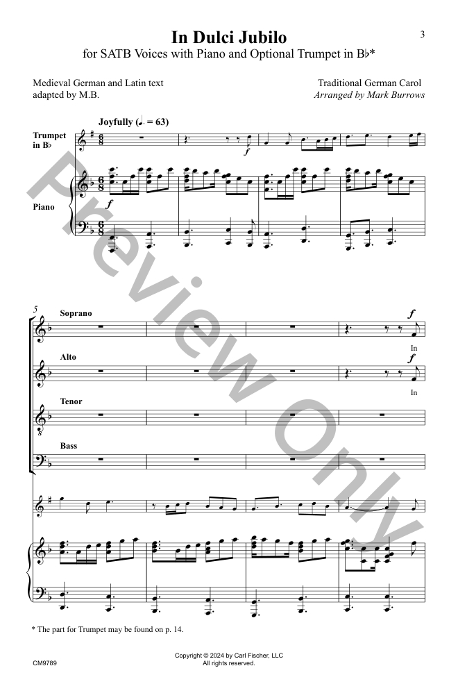 Uniquely combining German and Latin in this joyful holiday text, Burrows arrangement for SATB choir, Piano and Opt Trumpet is sure to set your holiday concert on fire! With canonic duets and joyful interplay between SA and TB, it is accessible and appropriate for both school and church alike.