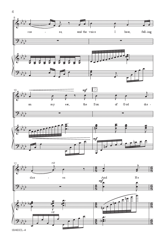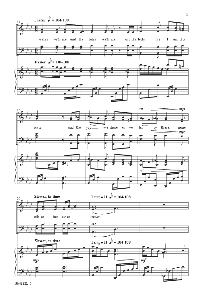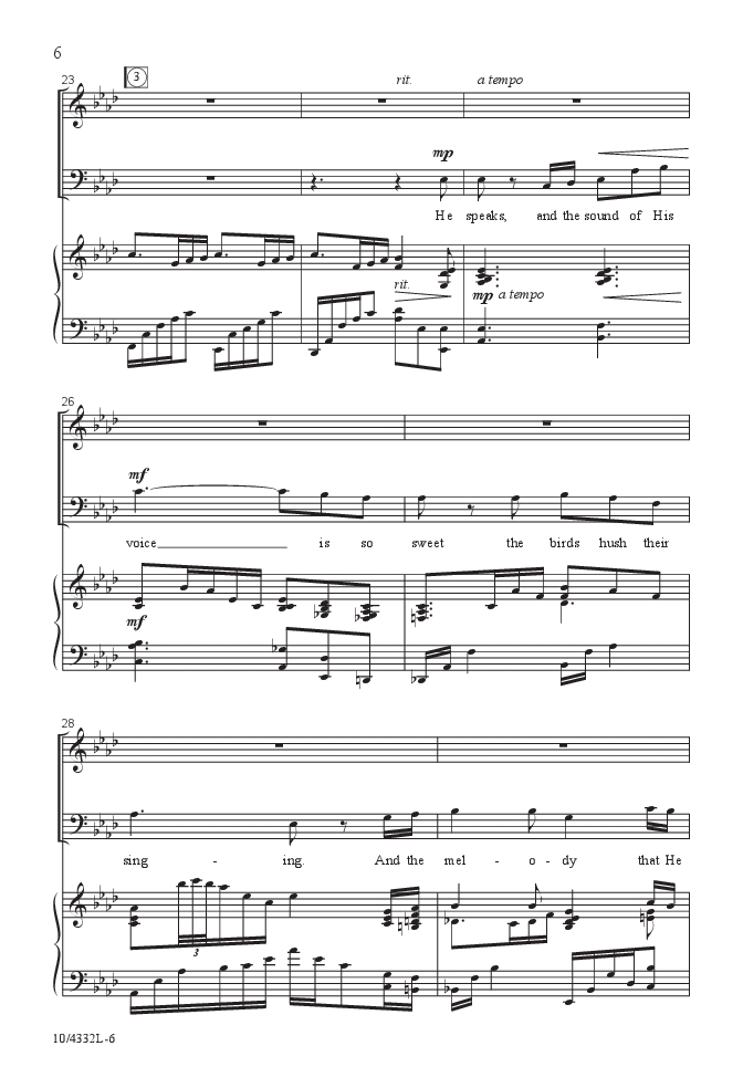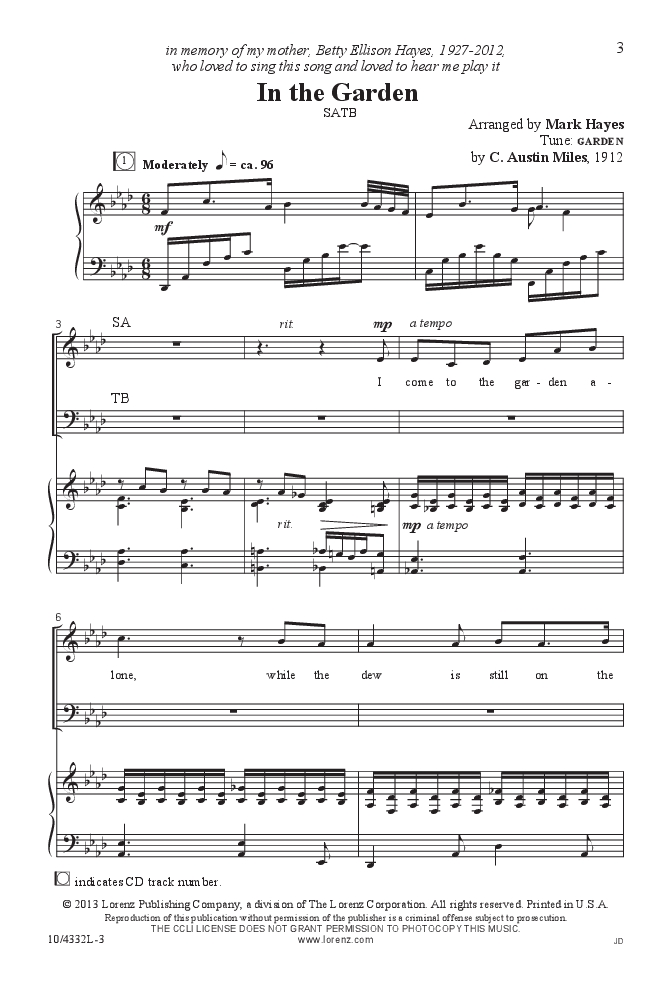 Mark Hayes transforms a beloved American hymn, “In the Garden,” with his own unique interpretive style. Gorgeous harmonic colors permeate the extraordinarily sensitive piano accompaniment that is rich yet playable.