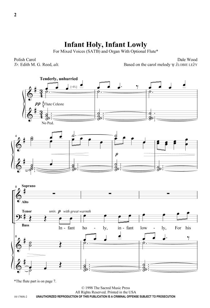 An exquisite blending of a hushed organ accompaniment, a gentle flute, and masterfully designed choral writing. This lullaby, based on a familiar Polish carol, is certainly one of this composer's most gorgeous efforts, and will surely be requested year after year.