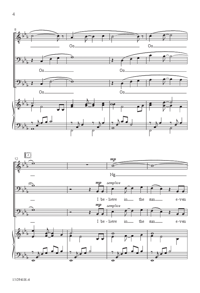 A profoundly moving text, written on a cellar wall during the rise of Nazi Germany, joins with original music to create a deeply emotional expression of hope. With brief narration and the echo of a Russian folk melody, this is an important contribution to the concert repertoire for more discerning choirs!