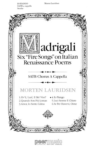 Madrigals by the Renaissance composer Monteverdi provided the inspiration for my own Madrigali. Symbolic images of flames, burning and fire recur often in Italian love poems from this era and my cycle on texts employing this fire motive blends stylistic musical features of the period (word painting, modality, bold harmonic shifts, intricate counterpoint, augenmusik, etc.) within a contemporary compositional idiom. The music emanates from a single, primal sonority (the “Fire-Chord”) which opens the piece and is found extensively throughout all six movements in myriad forms and manipulations, providing motivic unity to complement the poetic. This cycle of madrigals has been designated an American Choral Masterpiece by the National Endowment for the Arts.