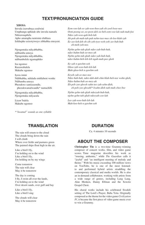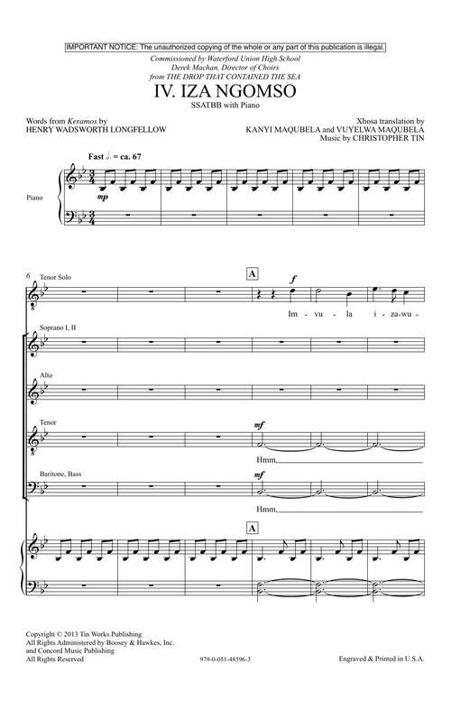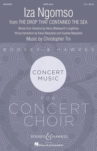 “Iza Ngomso” is the fourth movement of Christopher Tin's major work The Drop That Contained the Sea, and is based on water in one of its unique naturally occuring states. In the case of “Iza Ngomso”, a piece about clouds, the text is derived from an unusual translation of the Henry Wadsworth Longfellow poem “Keramos”: translated into Xhosa, one of the national languages of South Africa (and one of the African dialects that features prominent 'click' sounds).