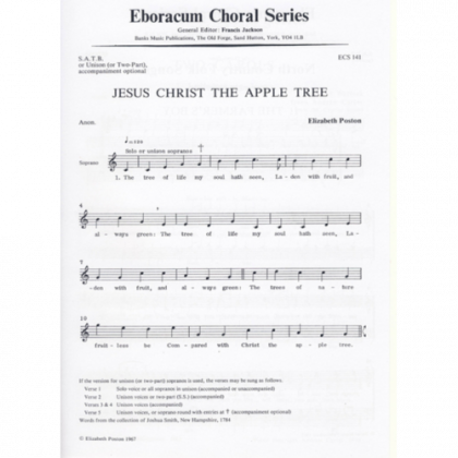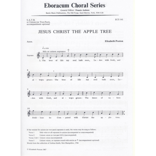 Jesus Christ the Apple Tree (also known as “Apple Tree” and, in its early publications, as :Christ Compared to an Apple-tree”) is a poem, possibly intended for use as a carol, written in the 18th century. It has been set to music by a number of composers, including Jeremiah Ingalls (1764–1838), Elizabeth Poston (1905–1987) and John Rutter.