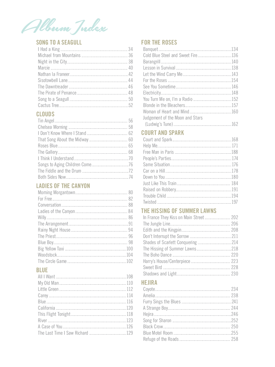 This songbook culls the best work from the following albums: Song to a Seagull, Clouds, Ladies of the Canyon, Blue, For the Roses, Court and Spark, The Hissing of Summer Lawns, Hejira, Don Juan's Reckless Daughter, Mingus, Wild Things Run Fast, Dog Eat Dog, Chalk Mark in a Rain Storm, Night Ride Home, Turbulent Indigo, Hits, Taming the Tiger, and Shine.