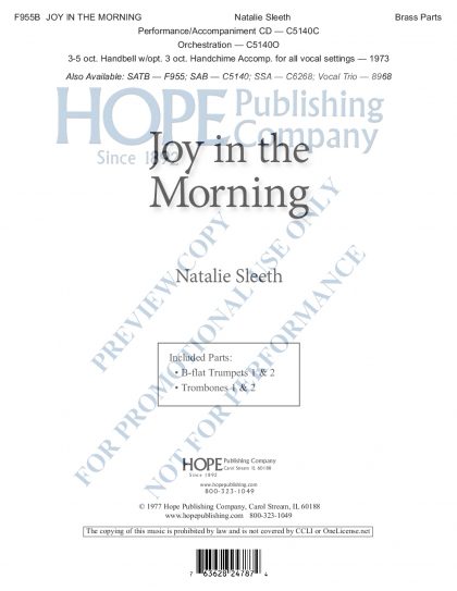 This original anthem is Far and away the best-selling anthem in the Hope catalog with over one million copies sold, Natalie Sleeth's “Joy in the Morning” is a true classic. This is indispensable choral music!