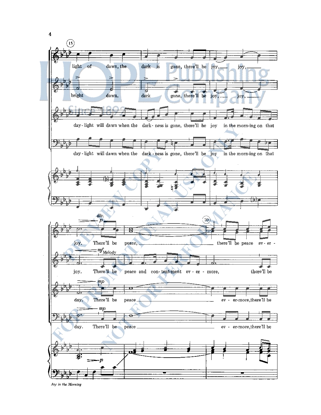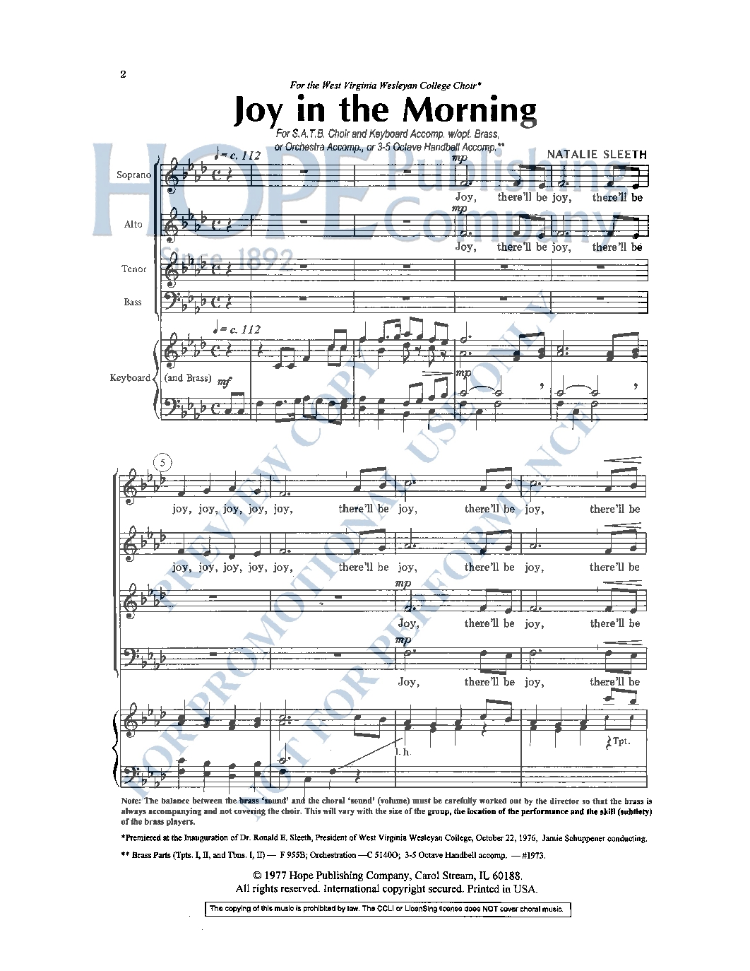 This original anthem is Far and away the best-selling anthem in the Hope catalog with over one million copies sold, Natalie Sleeth's “Joy in the Morning” is a true classic. This is indispensable choral music!