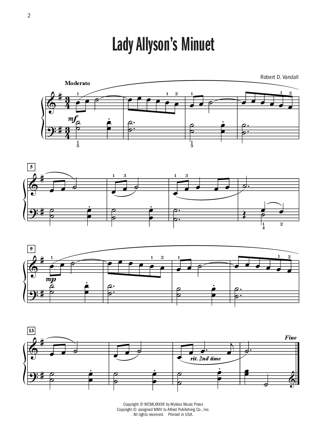 This has been a favorite solo sheet for many years. Neoclassical, optional mordents and trills, dance theme (minuet), G Major, 3/4 meter. Also available in the collection Celebrated Piano Solos, Book 1 by Robert D. Vandall.