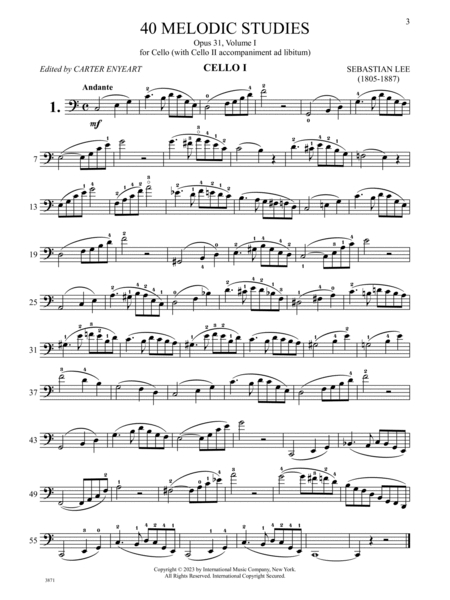 For Cello (with Cello II accompaniment ad libitum). These studies progress from lower left hand positions to thumb position, while introducing various bowing techniques. Newly composed second cello accompaniment by Carter Enyeart.