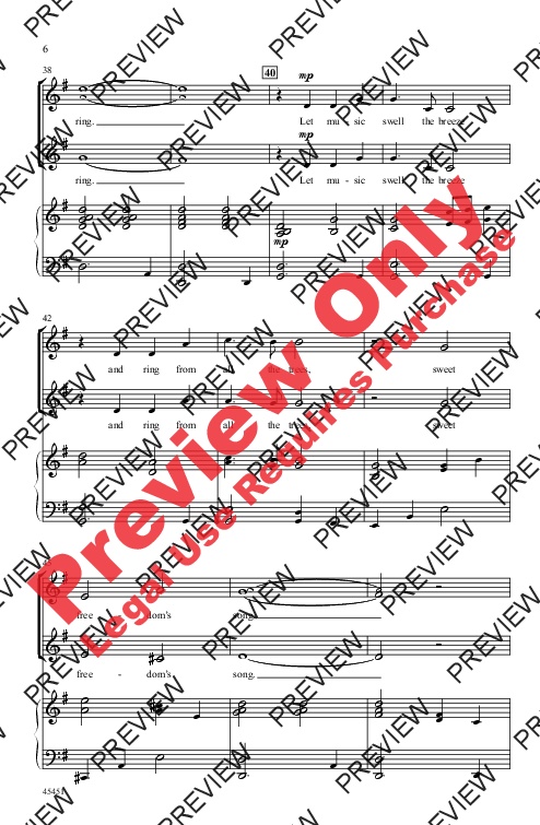 Patriotic and uplifting, the lyrics of “America” are set to a sweeping new melody, which leads into a stirring original chorus. A fully-harmonized refrain from “America the Beautiful” also appears as this exciting piece nears its grand finish.