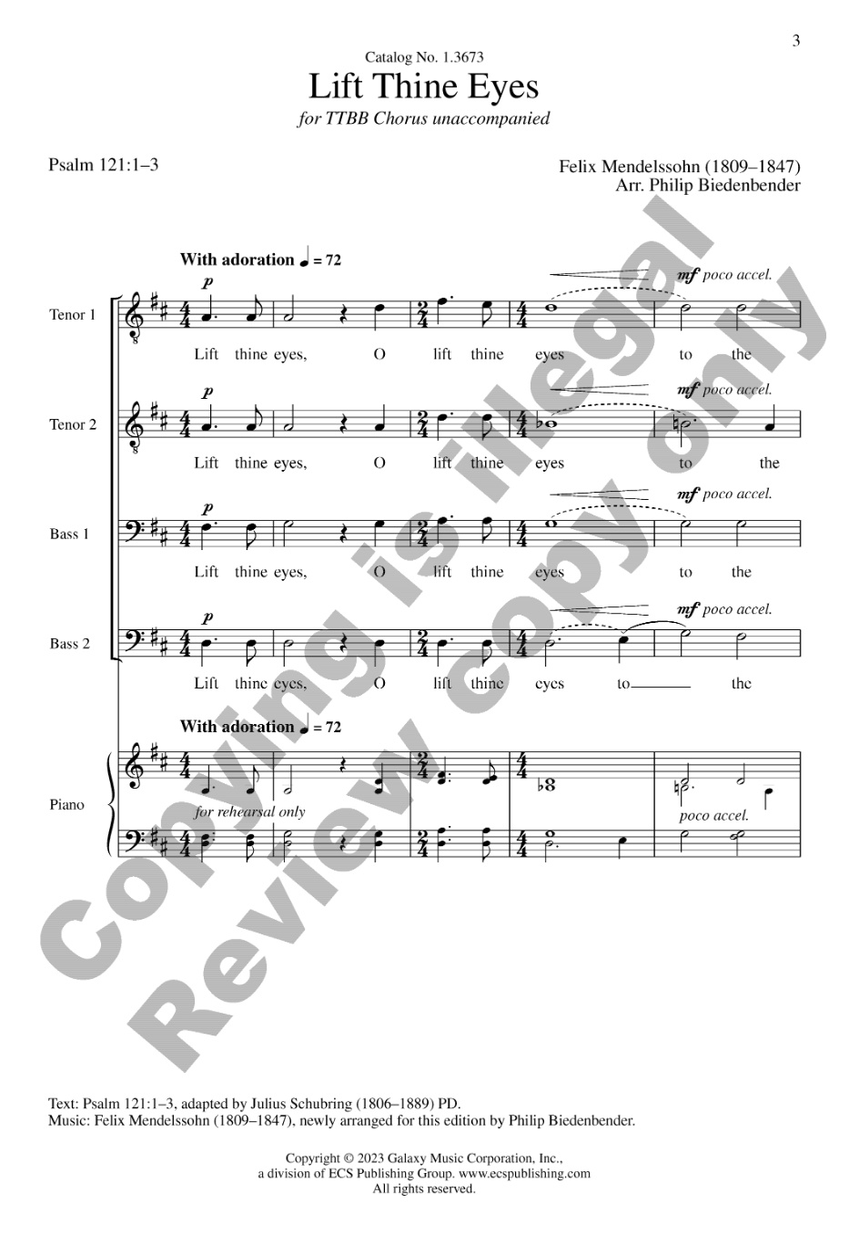 This setting for TTBB ensemble re-envisions Mendelssohn's popular movement from Elijah. It is a good challenge for a younger TTBB ensemble and is also rewarding for an adult ensemble.