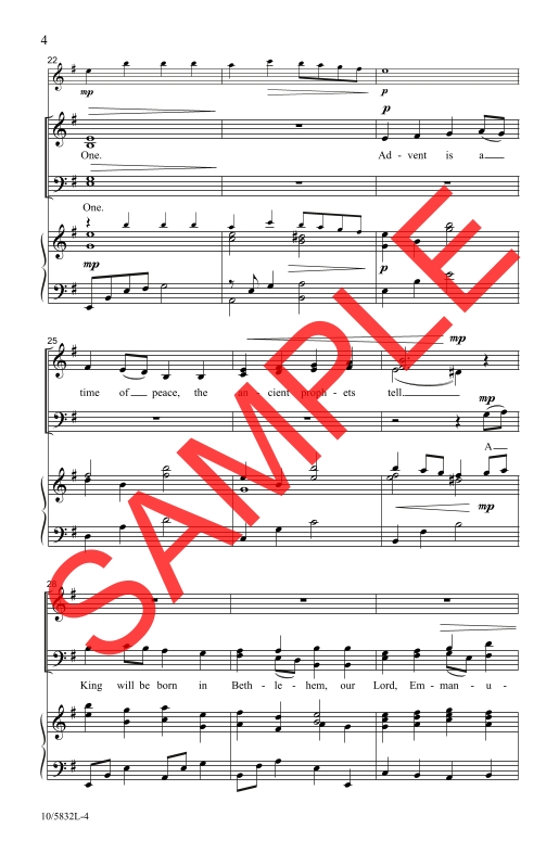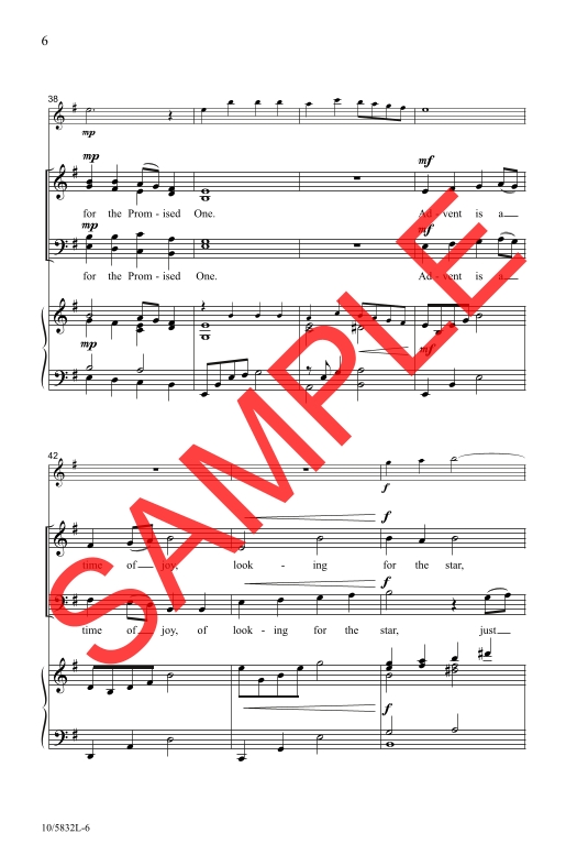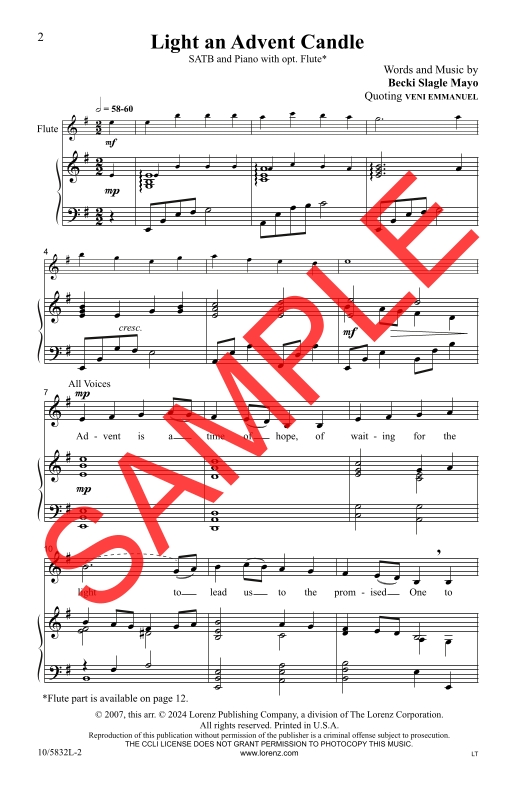 This best-selling anthem by Becki Slagle Mayo explores the Advent themes of hope, peace, joy, and love promised by the prophecies of the coming Savior. The choral writing features many canonical moments as well as beautifully crafted homophonic sections, and the optional flute adds the perfect musical color to this meaningful piece.