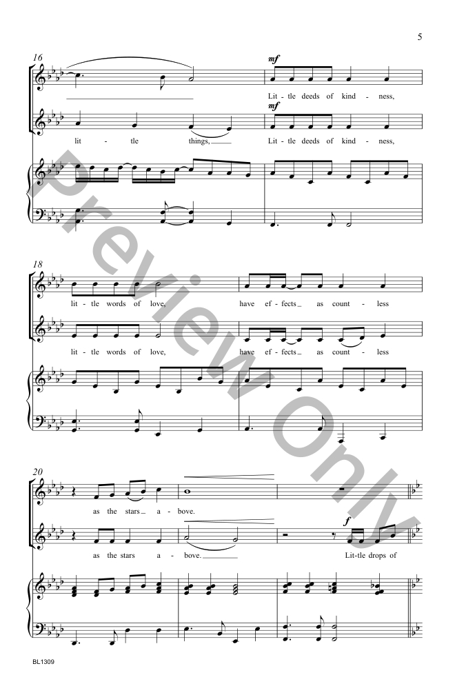 We don’t always realize the ripple effect that occurs when we perform small acts of kindness or share words of love with those around us. These seemingly insignificant actions can have such a positive impact and make the world a better place. Thus is the premise for this delightful and thought-provoking SA choral, sure to spark much wonderful conversation and, hopefully, lead to actions of the same nature!