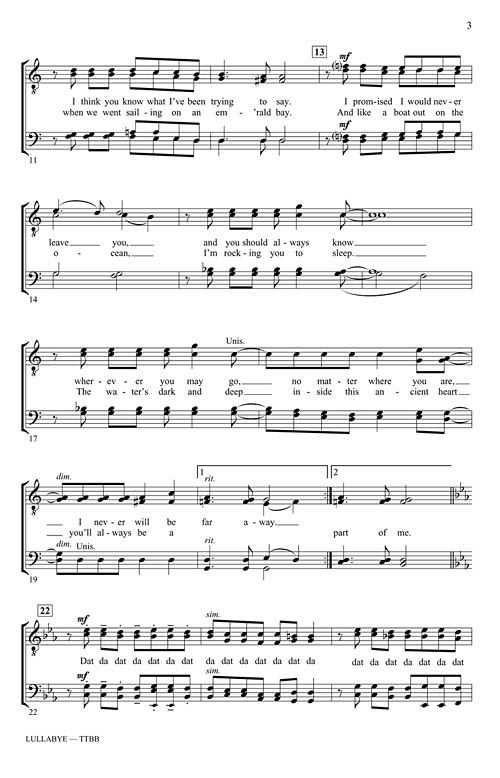 This sweet and simple lullaby by Billy Joel on his River of Dreams album is now offered in a stunning arrangement from the King's Singers. The SATTBB is the original version, and the SATB and TTBB simplify it to just four parts while maintaining the stunning contemporary a cappella harmonies. It's breathtaking!
