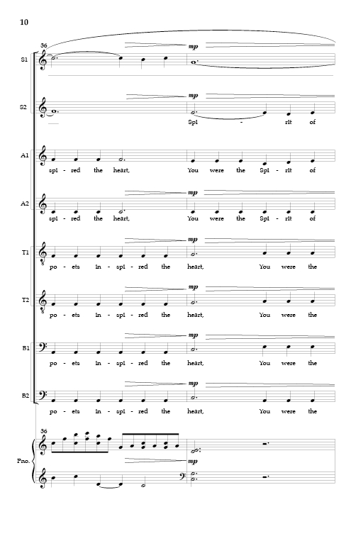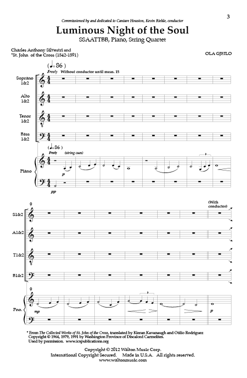This moving, lush and symphonic work with piano and string quartet has a contrasting brighter, lighter feel than Dark Night of the Soul. Added contemporary text describes the divine spirit of all art. An outstanding work!