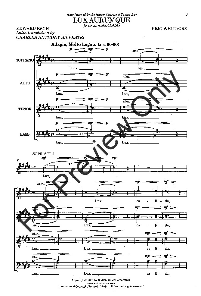 For the setting of Lux Aurumque, the composer chose the Latin translation of an Edward Esch poem, enhancing the elegant simplicity of this new work. The tight harmonies will need to be carefully balanced by a well trained a cappella choir. Suitable for an advanced high school choir and beyond.