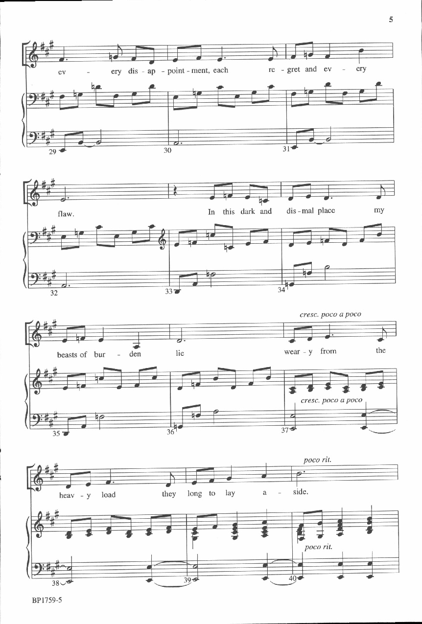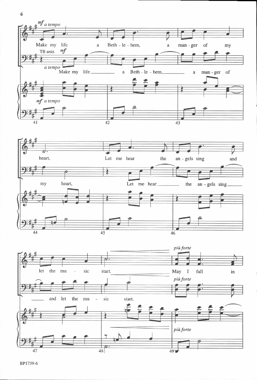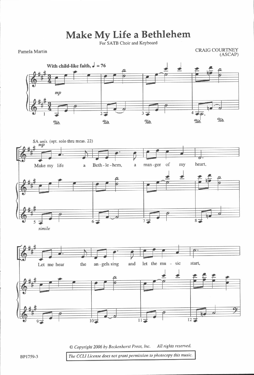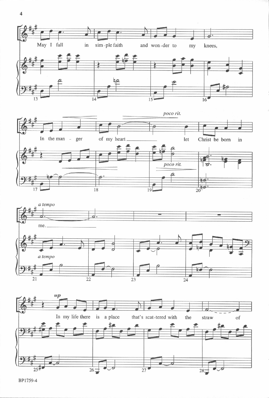 This SATB anthem by Craig Courtney takes the Christmas story and turns it inward as the singer contemplates living out the meaning of Christmas and allowing Christ to not be born in a manger, but rather in their heart. Fitting for the Christmas season.