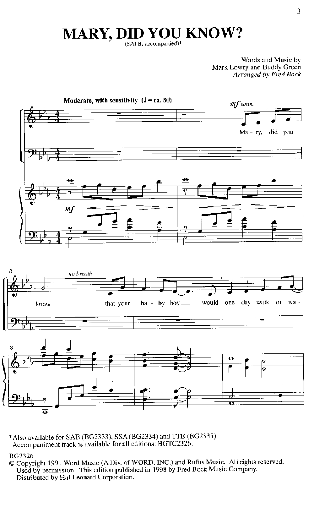 An SATB arrangement of Mary, Did You Know? arranged by Fred Bock.