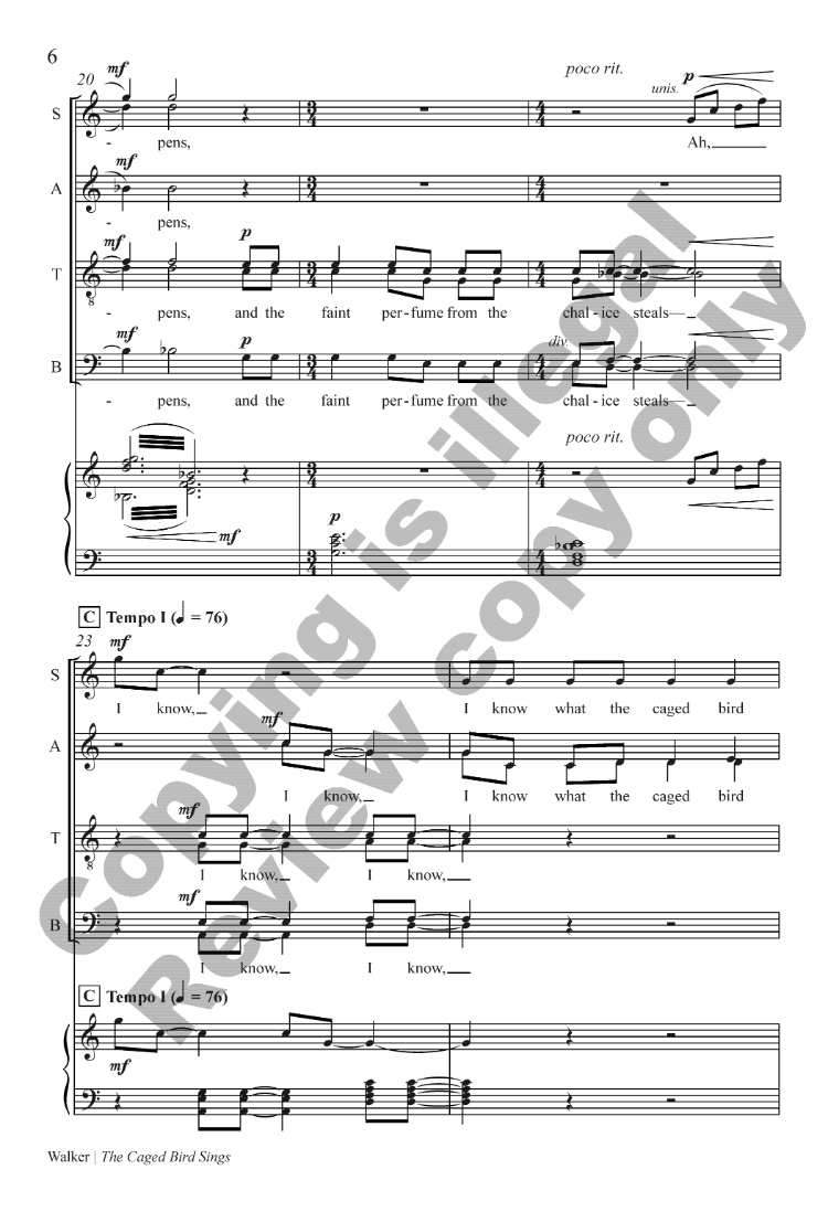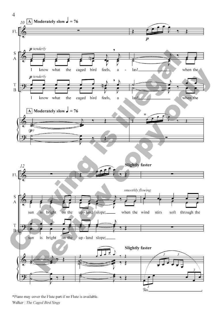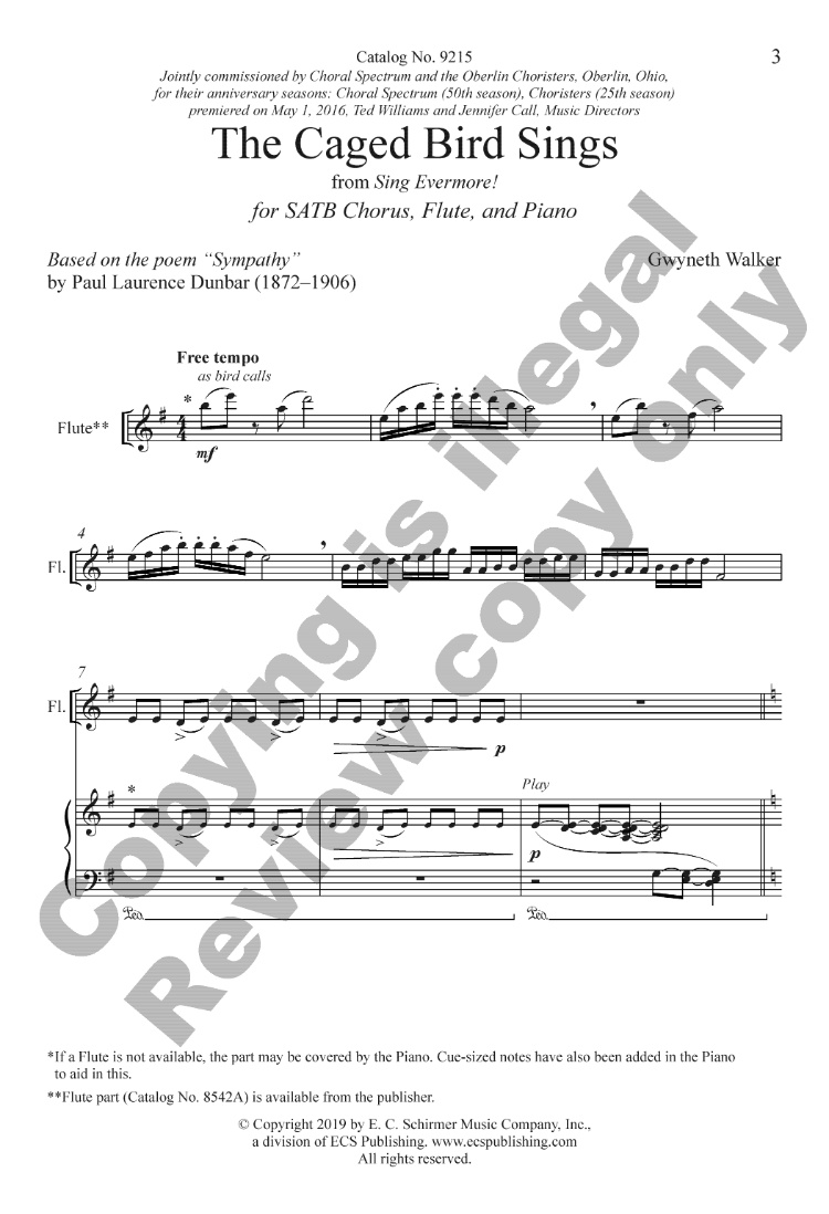Based on a poem by African American poet Paul Laurence Dunbar (1872–1906). The bird, a prisoner in his cage, beats his wing until the blood is red on the cruel bars. He sings a plea, to Heaven, for he would be free.
