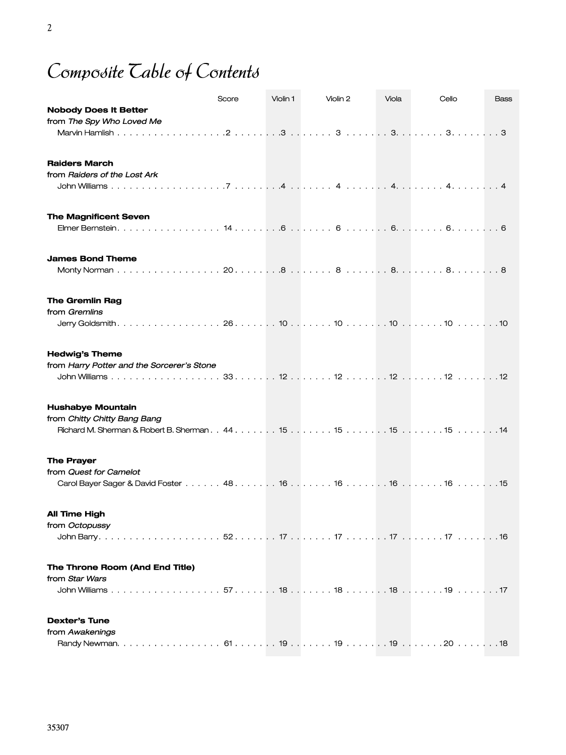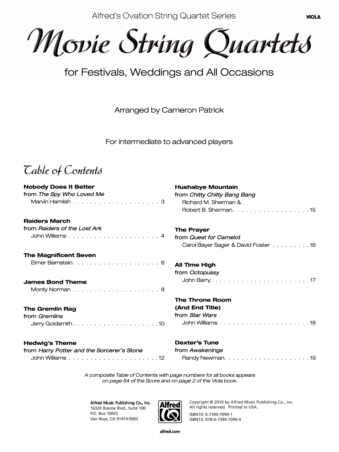 A collection of movie hits wonderfully arranged for intermediate and advanced level string quartets. Perfect for high school, university, and professional quartets! The optional bass parts also allow for use in the high school, university or community orchestra. Just the thing to read through at wedding receptions, parties, and other events.