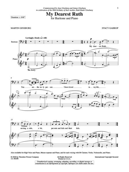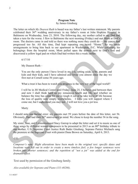 Powerfully poignant and equally tender, My Dearest Ruth is Garrop’s musical setting of the final love letter from Martin Ginsburg to his wife, the opera-loving Supreme Court Justice Ruth Bader Ginsburg, only days before Martin’s passing. Commissioned by the family to celebrate Justice Ginsburg’s 80th birthday, the work later became a highlight of the Cedille Records CD “Notorious RBG in Song.” My Dearest Ruth is a touching 6½-minute scene, touching in sound, deeply dramatic in meaning.