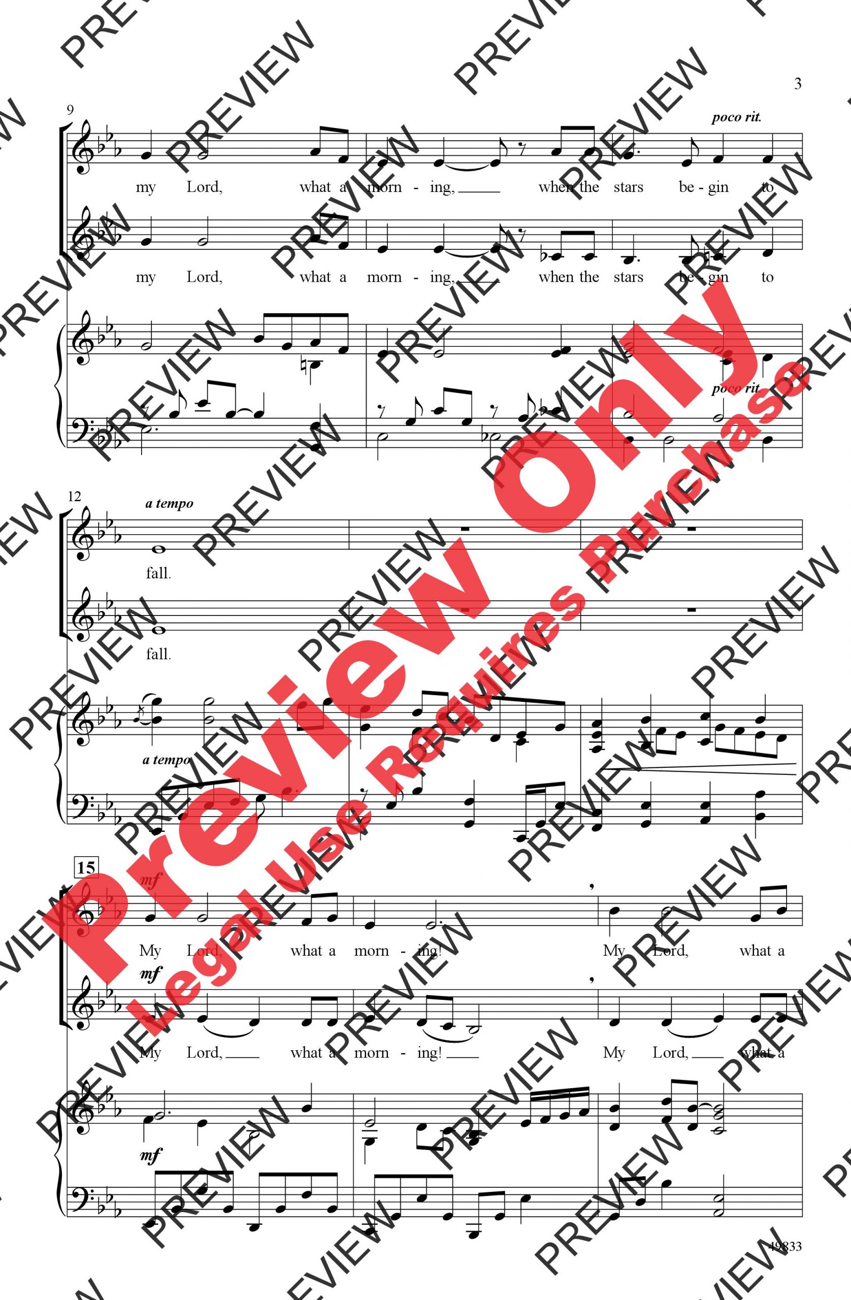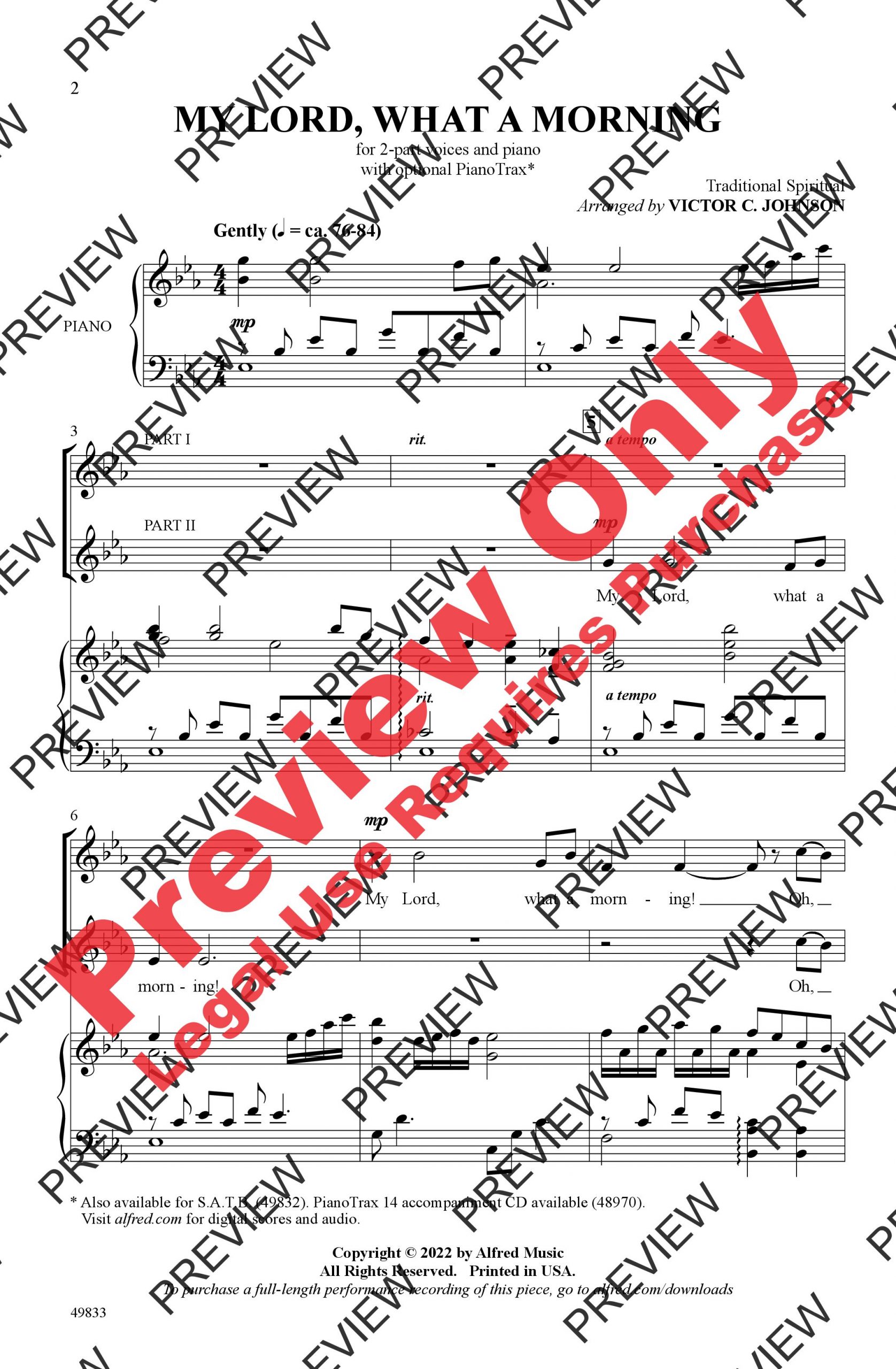 Here's a beloved American spiritual, sensitively prepared for school and church singers by Victor C. Johnson. The familiar strophic melody is fully arranged with progressively richer sonorities throughout. Expressive tempo markings stretch the final moment of every phrase and suggest more motion for the “hear the trumpet sound” verse. A lovely piano accompaniment does not double, but rather decorates the satisfying choral parts. A gentle gem that grows to an impressive height before a quiet conclusion.