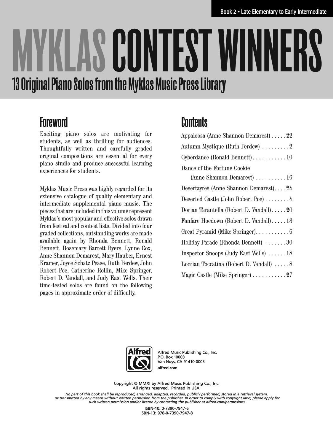 Myklas Music Press was highly regarded for its extensive catalogue of quality elementary and intermediate supplemental piano music. The pieces that are included in Myklas Contest Winners represent Myklas's most popular and effective solos drawn from festival and contest lists.