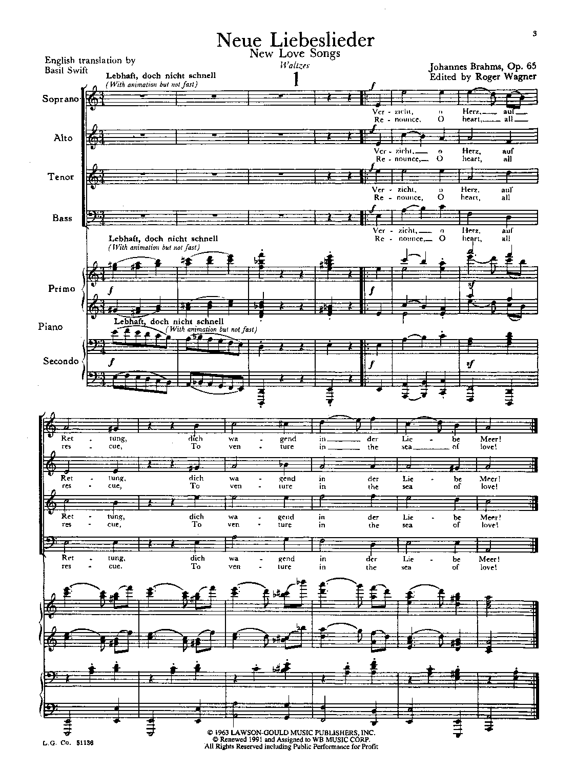 Edited by Roger Wagner, Neue Liebeslieder Walzer, Opus 65 presents 15 choral pieces in SATB voicing.