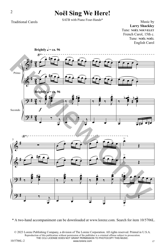 Larry Shackley has brilliantly arranged two famous carols, Sing We Now of Christmas and Masters In This Hall, for SATB choir and piano four-hands. This piece will be the “showstopper” moment of any Christmas concert or festival. Larry's penchant for writing exciting piano accompaniments is on full display, and each section of your choral ensemble is featured in always shifting vocal combinations. A two-hand accompaniment is also available. This one is not to be missed!