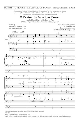 Lloyd Larson put on his most distinguished and regal robes when he composed this piece. Using a text by the revered theologian, Thomas Troeger, and poet John Oxenham, Larson presents a magnificent theme. The St. Peter hymn tune (In Christ There Is No East Or West) with congregation crowns the anthem beautifully. Scored with optional brass and percussion, this commission praises God and honors our unity in Christ.