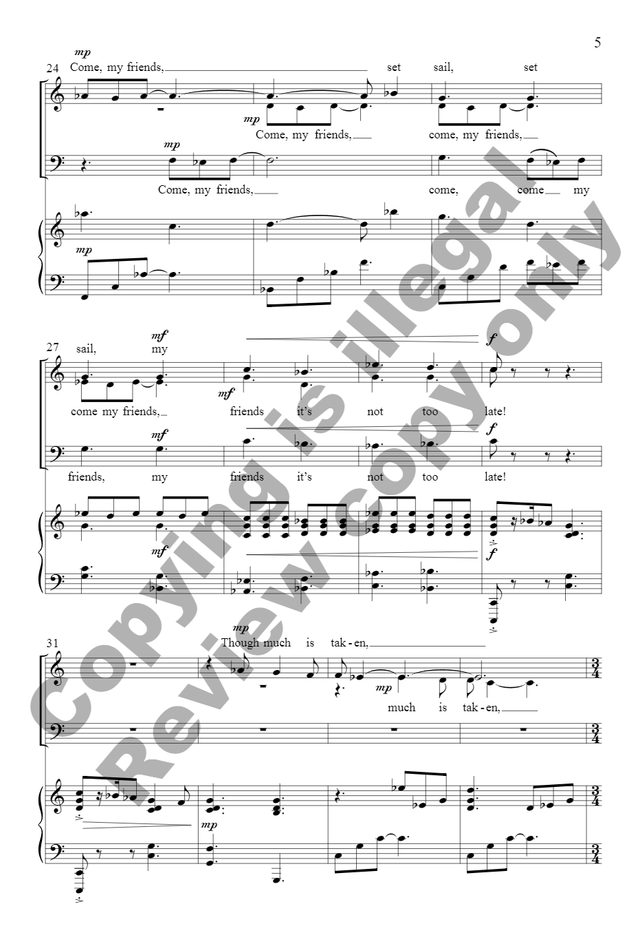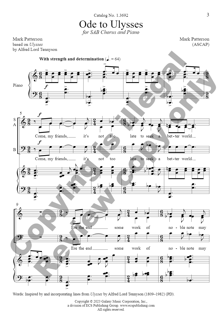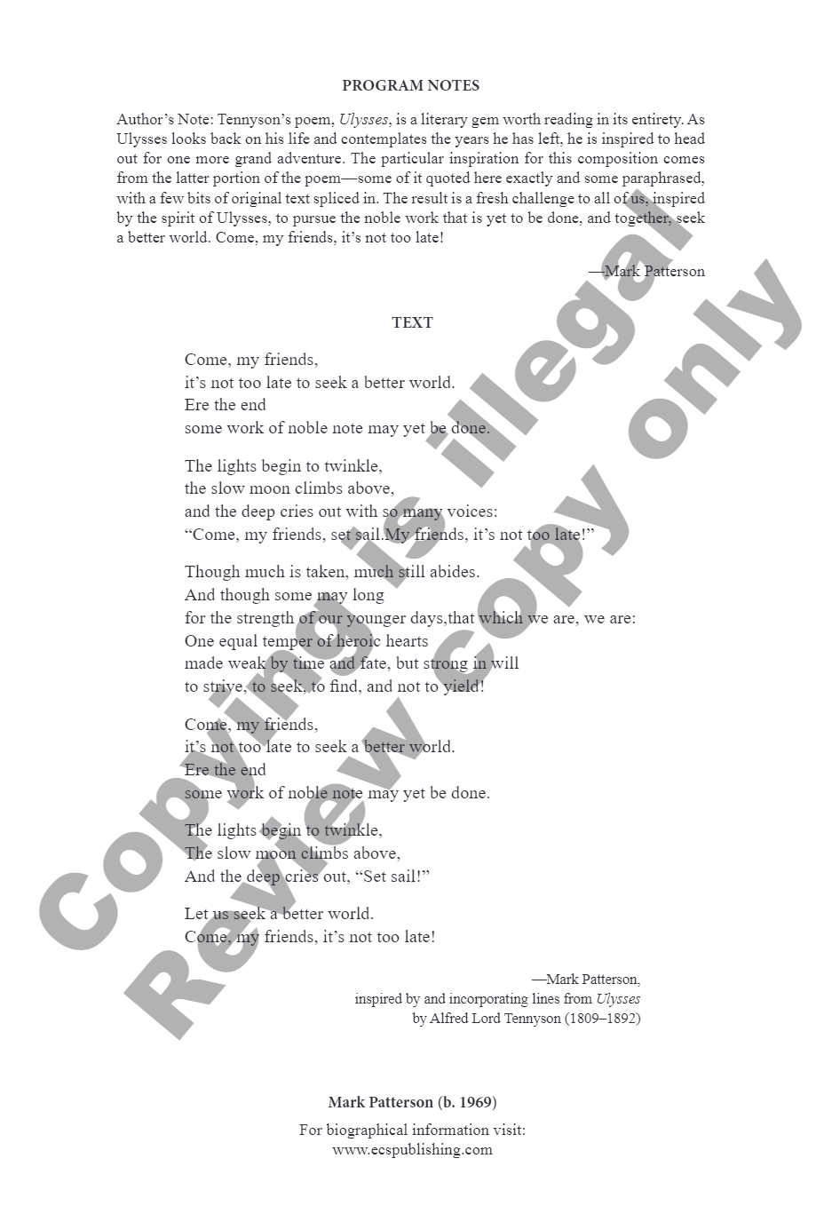 This new work set to a Tennyson text calls us all to strive for a better world. The writing is very accessible for middle school and high school mixed choirs.